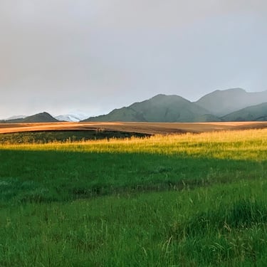 Fertile, grassy fields wind-swept to the imperious mountains’ edge where pollen-dusted clouds roam across an endless sky enveloping the entirety.